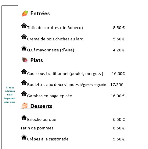 Les autres jours pour les groupes à partir de 16 adultes et en menu unique élaboré ensemble