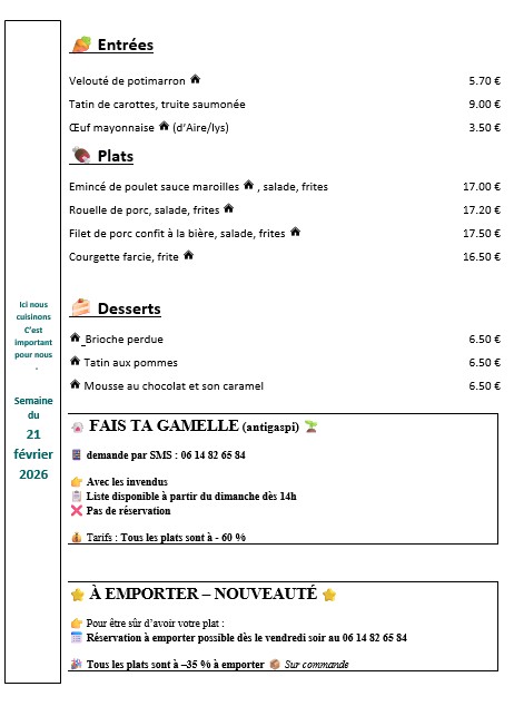 commande par sms au 06 14 82 65 84 dès la publication du menu