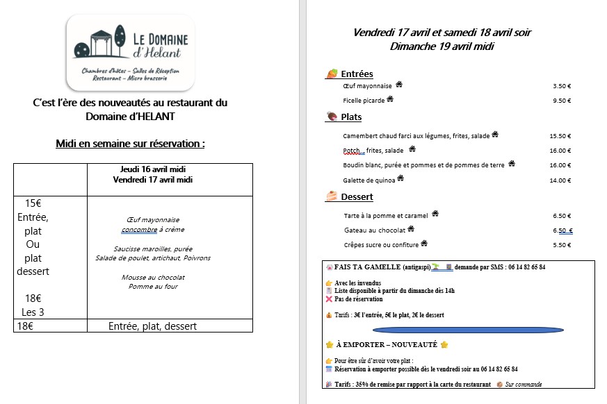 Retrouvez sur ma page le menu du restaurant du Domaine d'Helant à ECQUEDECQUES